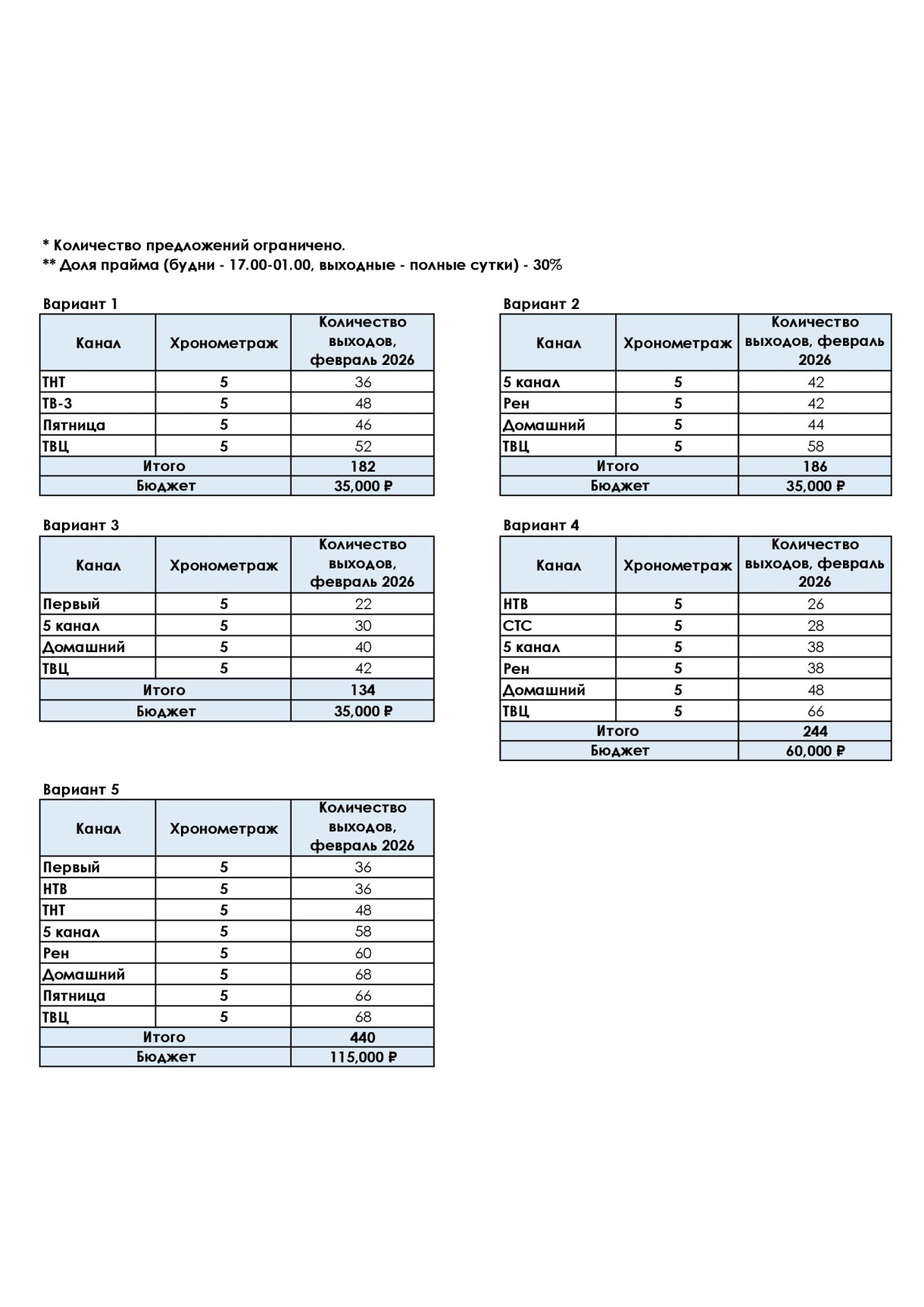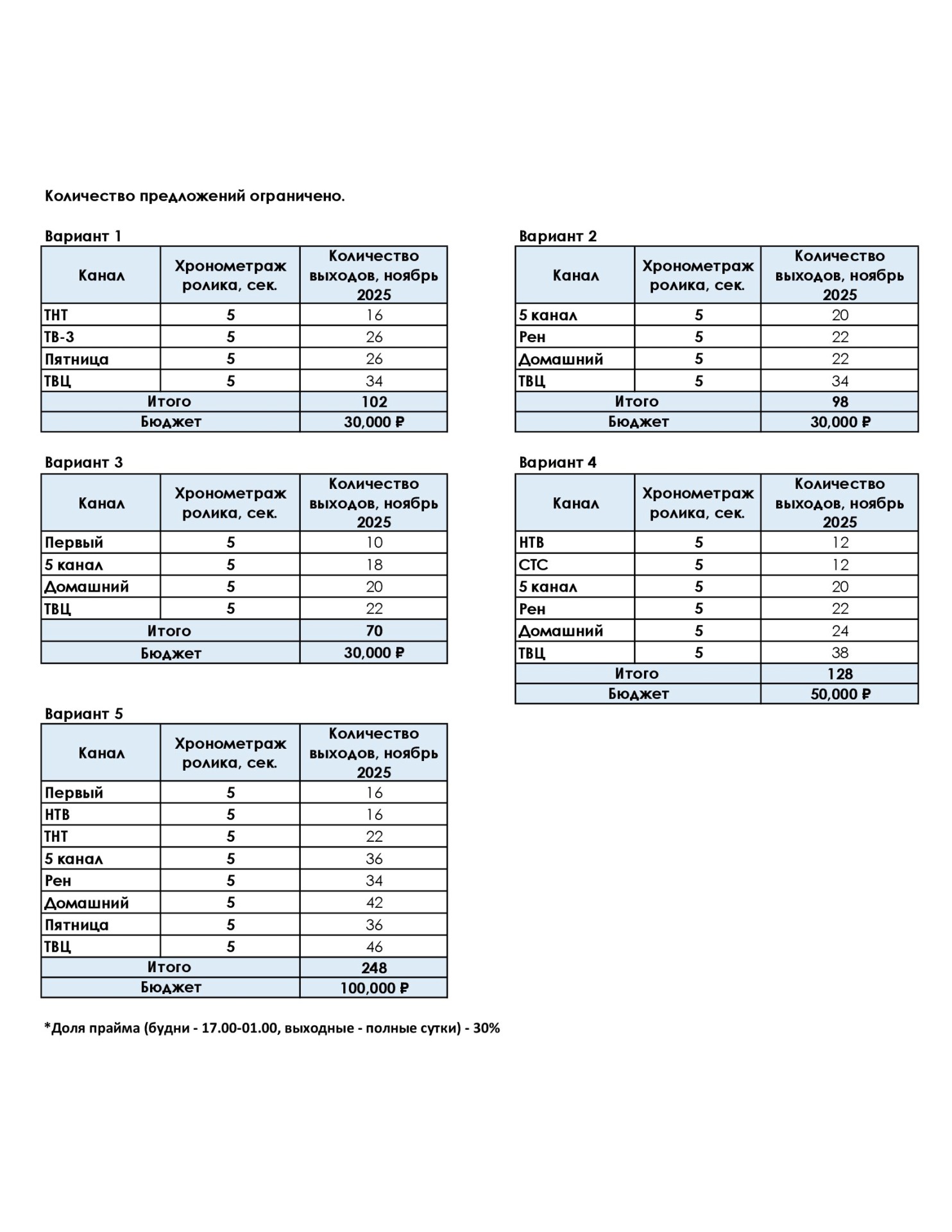 Бонусные пакеты с большими скидками на "1 Канал ", "Домашний", "СТС", " Рен ТВ", "5 Канал", "ТВ ЦЕНТР", и другие федеральные телеканалы. Для видеороликов 5 секунд , можно ставить и 10 секунд. Размещение плавающие утро -день - вечер.